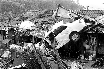 昨日上午,記者趕到現場看到,一輛“受傷”的白色轎車車頭朝下,車尾朝上,倒立著“掛”在民房的屋頂上,轎車車頭撞得面目全非,車身兩側凹陷,車內兩個安全氣囊也完全打開(見圖)。民房旁邊,一根水泥電桿攔腰被撞斷,地上還散落著汽車零部件,不少路人冒雨在看稀奇。