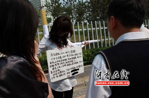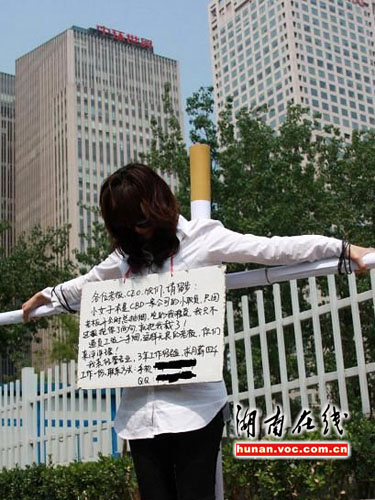 “為了找工作,真是無所不用!”日前,網友在華聲論壇發帖,稱在當地的一國貿大廈CBD辦事時,看見一年輕女子背著一個巨型十字架,雙手展開綁在十字架上,而她這樣做只為“求得一份工作”。