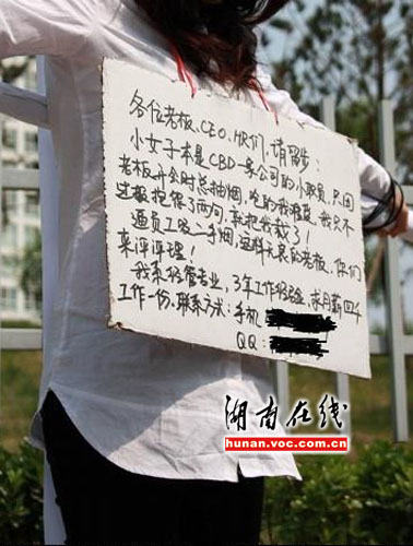 圖中女子身著修身白襯衣和黑色長褲,大幅框架眼鏡以及垂下的頭發遮住了臉,讓人看不清容貌。身上所背的十字架高出其頭頂,上面還有個過濾嘴,狀如香煙。據其胸前牌子上的文字描述,該女子是一“失業白領”,原老板喜歡在會議室吸煙,自己因受不了二手煙的危害,發了幾句牢騷,結果被老板辭退,所以采用行為藝術方式來求職。