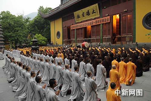 中新網杭州5月12日電(記者 柴燕菲 見習記者 周翌)一年前的今天,巴蜀大地一聲長嘆,舉國旗半落以致哀,笛長鳴以悲愴。一年后的今天,巴蜀大地重獲新生,如鳳凰涅磐。一年來,汶川的陣陣喘息,步步前進都牽動著全國人民的視線。2009年5月12日16時30分,杭州市佛教界各大寺院300余僧眾會聚千年古剎靈隱寺,隆重舉行汶川大地震一周年祈禱法會。