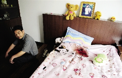 昨日上午,記者驅車趕到現場。走進房間,防盜門、窗戶、地板、床上到處都是血跡。兩間臥室的席夢思被燒糊。