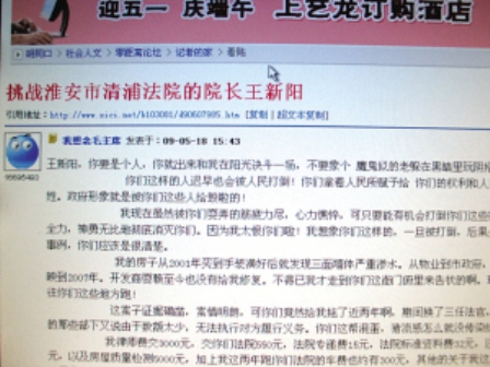 在西祠胡同網站上,記者找到曹先生5月19日發表的題為《挑戰淮安市清浦法院的院長王新陽》的帖子,帖子稱他花一萬多元打官司,最后卻只得到800元賠償。看完整篇帖子后,記者在為他的遭遇表示同情的同時也發現,該帖子情緒激憤 并有多處攻擊性語言,在帖子的結尾他將自己定性為挑戰人,而且留下自己的真實電話號碼。記者昨天根據法院判決書及對曹先生本人的采訪,了解了整個事件大致的來龍去脈: