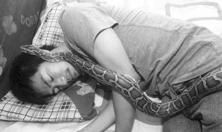 年輕人飼養另類動物已不足為怪,但住在武昌梨園附近26歲的趙晶養了緬甸蟒、平原巨蜥、蝎子等多種動物,他工資的大部分都用來飼養動物了。更讓人驚訝的是,他常年與蟒蛇同床共眠。