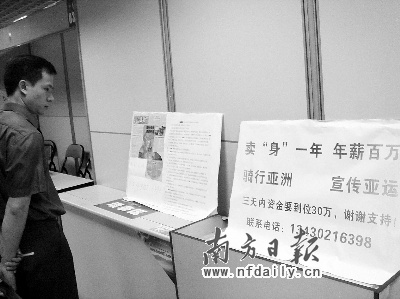 “賣‘身’一年,年薪百萬。”昨日上午10時,廣州天河路廣州購書中心六樓的人才市場赫然出現這樣一塊招牌。據悉,賣身者名叫蔡開仕,是華南理工大學一名碩士研究生。這次當眾“賣身”的目的,則是為一個“騎行亞洲宣傳亞運”的活動籌集資金。