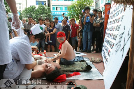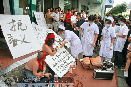 16時46分,廣西中醫(yī)附屬醫(yī)院的救護車到現(xiàn)場對商戶劉先生進行脈搏和血壓的測量,并建議馬上去醫(yī)院。在多次表明要堅持等城管相關(guān)領(lǐng)導(dǎo)來給大家做合理解釋時,商戶劉先生昏迷。在周圍群眾的幫助下,商戶劉先生被抬上救護車,送往廣西中醫(yī)附屬醫(yī)院救治。