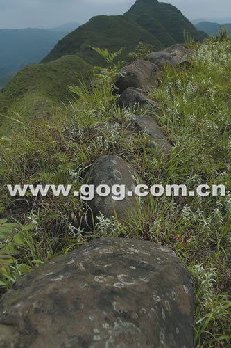 類似的排列巨石一直向東順著山脊兩側(cè)像長城一般蜿蜒近一公里,并且呈現(xiàn)出一定的排列規(guī)律:山崖南面堆砌的巨石體積巨大,且都是具有明顯的人工開采和打磨痕跡長方形或正方形石塊;而山崖北面的巨石幾乎都是未經(jīng)打磨過的石塊,呈不規(guī)則形狀,并且在堆砌時不及南面巨石那樣講究和規(guī)整,但同樣是一線排開。在山峰腰部茂密的草叢中,同樣有一些整齊排列的巨型方石,且山腰還殘留有人搭建的石階。