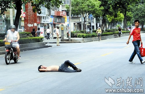 事發昨日正午,記者在漢陽郭茨口看到,一名男子上身裸露,手提一袋醫院的病歷資料,情緒激動地躺在馬路中央,脊背被路面燙得通紅。此時路面車流不息,該男子處境十分危險!翱彀阉貋恚 睅酌啡艘姞詈螅拷撃凶,欲將其拉到路邊,但該男子并不領情,堅決不起身。幾分鐘后,二橋派出所的民警趕來,要求該男子去派出所再說,該男子置之不理。民警表示,早8時許和10時許,該男子曾在附近路面躺過兩次,都被他們帶回了派出所,他們這已是第三次為該男子出警。“有什么委屈就說出來,那樣心里痛快點。”見民警束手無策,熱心路人們開始輪番上前勸解。眾路人汗流浹背,頂著烈日站在馬路中央,對該男子動之以情、曉之以理。半小時后,該男子陸續說出了心中的不快。又經勸解,該男子終于答應跟民警回派出所,將事情說清楚。