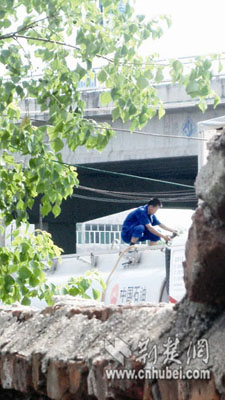 停車場的上面就是鄂黃大橋,記者繞行來到橋上面。剛找準(zhǔn)位置停下,就看見一輛車身上印有“中國石油”的油罐車駛?cè)胪\噲觥<s5分鐘后,一名光著上身的男子開著三輪車駛?cè)耄嚿涎b著幾個(gè)大的空塑料油桶和一根塑料油管。油車司機(jī)迎了上去,并把三輪車停在油車的一側(cè)。約十分鐘后,三輪車駛出停車場,塑料桶內(nèi)已裝滿汽油。