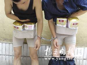 昨天下午3點半左右,兩名男子在南京建寧路一家超市里偷了4聽奶粉藏在內褲里準備偷運出超市。在超市門口被保安發現后,兩人四處逃竄,其中一人跑到奶粉貨架處,脫了褲子就把奶粉放回貨架上,但還是被保安和熱心的市民抓住。令人啼笑皆非的是,偷奶粉的兩名男子竟然各穿了三條女性緊身內褲方便作案。