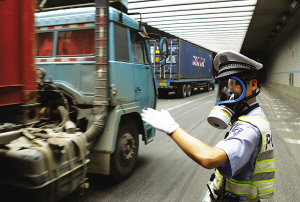圖為昨天中午,寶山交警支隊(duì)民警何海清在外環(huán)隧道內(nèi)頭戴防毒面具值勤,外環(huán)隧道內(nèi)的汽車尾氣加上高溫天的熱度,能讓人窒息