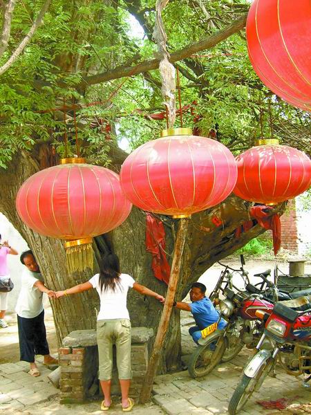 “這棵樹可有年頭啊!”村民楊更偉說,這棵大槐樹已有一千多年的歷史,樹干周長將近5米,5個成年人才能把這棵大槐樹環抱住(如圖),偶爾會有人在樹下燒香,樹洞里布滿了蜘蛛網,一直沒人管理。