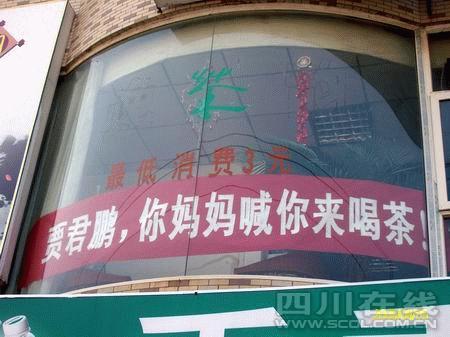 記者隨機詢問了幾名路人,大多數的人并不知道這句話的意思,一名40來歲的大姐說:“也許是茶樓打的廣告吧,但這個又不像是廣告,為啥子只喊賈君鵬一個人來喝茶呢?而且是他‘媽媽’在喊,這太奇怪了!”