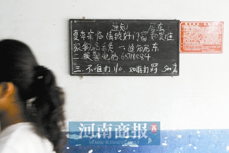 李先生是這棟樓的房東,身后墻壁掛的黑板上,寫著一則通知:“夏季來臨請鎖好門窗,如果誰家物品丟失:一、通知房東;二、報警電話65718584;三、不準打110,如誰打罰500元。”
