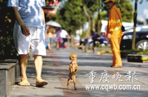 來自九龍坡區 近1個月,直港大道建宇大廈小區至九濱路江邊人行道,小鹿犬“丑丑”陪主人蔣思全散步,引來許多路人用手機拍照,甚是出名。