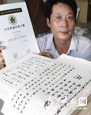 高淳縣椏溪鎮荊山村農民張正福,利用6年時間反字倒抄紅樓夢全集,共120回,86萬字,并順利獲得大世界基尼斯之最證書(如左圖)。為了給附近村民修建一條長約一千米的水泥路,他決定將這些手抄本賣給有收藏條件的愛好者。