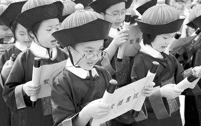 9月1日,杭州紫陽小學舉行了一場特別的新生入學儀式。小學新生穿戴著類似影視劇中的清朝衣服、帽子,手捧黃色書卷,誦讀入學三字經,向師長行禮。