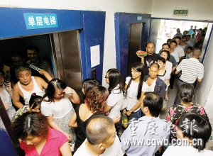 3日晚7時,記者在金島花園E-House大廳發(fā)現(xiàn),單層電梯前已排了20多個人,因大廳沒空調(diào),燥熱難當(dāng),部分市民急得大聲罵娘。怕滋生事端,物管派來幾名保安現(xiàn)場維護秩序,發(fā)現(xiàn)有插隊的居民,出面制止。