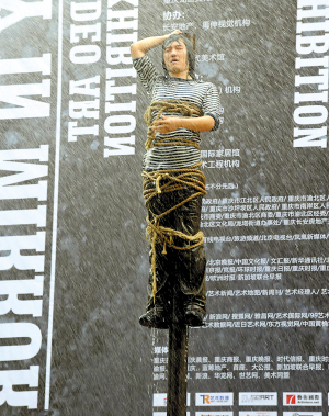 37攝氏度的高溫下,26歲的王軍被綁在近10米高的柱子上,先是被酷熱“折磨”了半小時,后又被環衛車的水龍頭沖淋了半小時,耗費了8噸自來水,總共耗時兩小時。這個名為《守望》的行為藝術作品昨天下午在黃桷坪102藝術區雷倒了不少人。