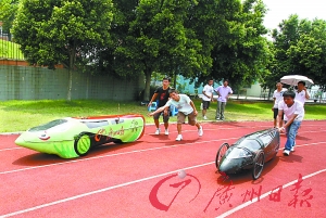 歷經(jīng)暑假兩個多月打造,外形如一顆黑色子彈、25毫升汽油可跑8000米的概念車“子彈頭”驚艷亮相,近日在華農(nóng)大操場進行了性能測試。這輛車的制作團隊主要由30多名大三大四學生組成,從制作配件到設(shè)計安裝全部手工完成。該車全長3.2米,高70厘米,重約20公斤,由一人駕駛,時速可達40~50公里,本月下旬將赴上海參加一項節(jié)能車競技大賽。