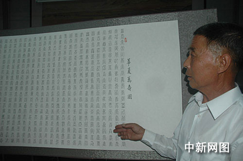 中新網唐山9月8日電 (白云水 雷向東)8日,河北省遵化市退休干部劉宗易80米長、由10000個異體壽字組成的“華夏萬壽圖”正式完成。劉宗易稱,此舉為慶祝新中國成立60周年獻禮,寄托自己對祖國的一片祝福之情。