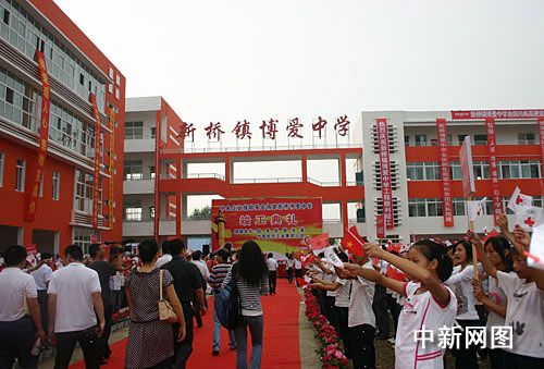 中新網綿陽9月8日電(霍潺)中國航空工業集團公司通過中國紅基會“中央企業援助基金”捐資1000萬元人民幣援建的綿陽市游仙區新橋博愛中學8日竣工。在紅白相間的新教學樓前,同學們揮舞著手中的五星紅旗和中國紅基會會旗,齊聲唱著愛的奉獻,感謝社會的無私關愛。