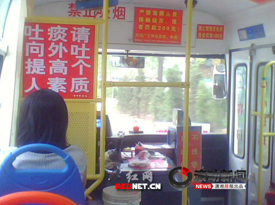 帖中附有多幅圖片,皆拍攝于公交車(chē)前門(mén)靠駕駛室的位置,在司機(jī)臺(tái)后方,有幅標(biāo)語(yǔ)煞是顯眼,紅底,粗體白字,上面寫(xiě)著:吐痰請(qǐng)向外吐,提高個(gè)人素質(zhì)。車(chē)窗前頭有禁止吸煙,嚴(yán)禁駕駛?cè)藛T觸摸錢(qián)幣等標(biāo)語(yǔ),還有特有的黃色鐵桿,座位,都證實(shí)這是一個(gè)標(biāo)準(zhǔn)的公交車(chē),發(fā)帖人稱此車(chē)系江蘇宿遷的公交車(chē)。