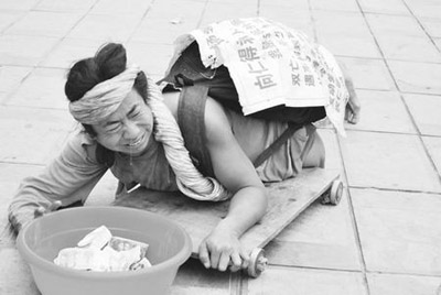 下午4時許,中年男子將自行車藏在樹后,變成一名衣衫襤褸的乞討者出現在眾人眼前。他趴在一個木板上,木板下邊有4個小輪子,他用胳膊和右腿支撐地面,身體通過滑板向前滑動。他的背上還貼著一張寫有“痛苦家世”和“悲慘往事”條幅。他滿臉淚痕,伴著嗚嗚的哭聲,引來很多行人關注。記者看到,短短5分鐘內,就有十幾名市民把錢放入他面前的塑料盆中。