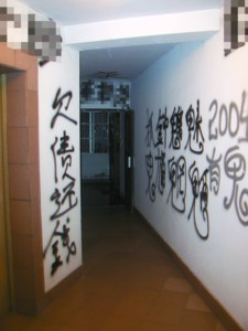 昨晚,記者在該樓20層看到,雪白的墻面上幾乎被黑漆涂滿了字。居民走出電梯或家門,映入眼簾的便是“殺”、“死”、“此屋有鬼”、“欠債還錢”之類的大字。2004室的鐵皮防盜門已被砸得嚴重變形,門鎖上方有一個碗大的窟窿。透過窟窿,記者發現里面似乎已多時沒有人住了。