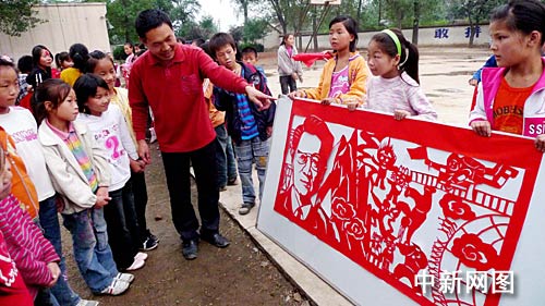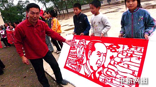 據(jù)了解,該校老師王贊強用一個月時間把《東方紅》、《江山多嬌》、《春天的故事》、《走進新時代》等十首紅歌,剪出紅歌剪紙作品,來祝福新中國60華涎。每張紅歌剪紙用朱紙做原料,長1.5米,寬0.8米。《東方紅》剪紙內(nèi)容除毛澤東主席頭像外,還有學大寨、第一顆衛(wèi)星上天及原子彈爆炸等內(nèi)容。《江山多嬌》有胡錦濤總書記頭像、奧運會、神六上天等內(nèi)容,每張紅歌剪紙都包含著濃烈的時代氣息。