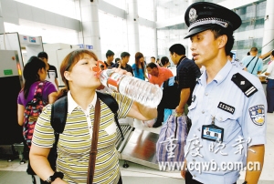 昨日下午2時許,(重慶市)龍頭寺候車廳檢票處,凡是拿著礦泉水瓶進站的乘客,都要先喝一口,然后才能順利進站。據悉,這是重慶鐵路公安處新出臺的安檢規定:凡液狀體物品進站,一律開瓶檢查,而自帶飲料的,則必須親自喝一口。