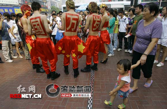 原來,5名自稱90后的男女,身上被涂彩繪,發型怪異,穿著國旗短褲,背上分別寫著“祖國萬歲”四個字,在這里搞行為藝術。另外一名妖艷女子,則在給路人發放紅色傳單。