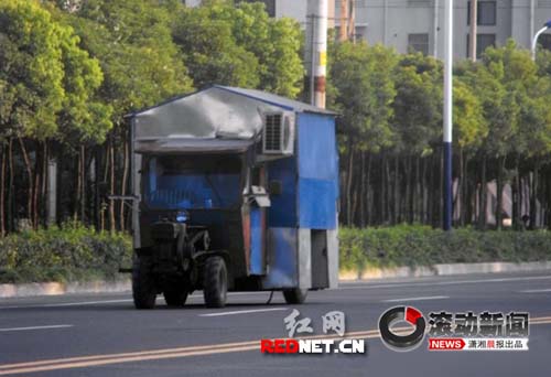 從房車的正面來看,該房的主體就完全顯露出來了,車的前部是一輛舊式手扶拖拉車,輪胎、水箱、傳動皮帶一應俱全;中部是駕駛室主體,跟街頭常見的殘疾車一樣。主要由駕駛室、前面檔風玻璃、觀后鏡,一樣都不少,更讓人稱奇的是這輛房車騎駛室頂端(即觀后鏡上方),裝著一臺空調掛機的主機,顯示這臺房車即便是在炎熱的夏天,也依然能照常使用。房車后部則是主體部分,鋁合金制的車廂、三角形車頂、兩個后輪,構成一輛移動的房車。