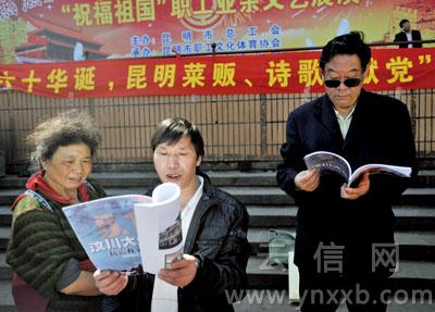 “黨啊!偉大的黨,60華誕的今天,我為您歌頌不朽的贊歌寫下您愛民的詩篇……”鄧成友的朗誦吸引了不少男女老少駐足傾聽。