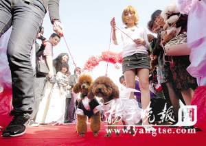 昨天,兩只身穿結(jié)婚禮服的寵物狗正在領(lǐng)取結(jié)婚證。當(dāng)天,南京首屆寵物集體婚禮在南京綠博園內(nèi)舉行。15對寵物狗“新人”伴隨著婚禮進(jìn)行曲逐對踏上紅地毯。狗狗們不但領(lǐng)取到寵物結(jié)婚證書,還互相贈(zèng)送了愛情信物。據(jù)悉,寵物集體婚禮在南京尚屬首次,別開生面的婚禮現(xiàn)場吸引了不少市民前來捧場。圖為一對可愛的泰迪犬夫妻領(lǐng)到了結(jié)婚證。 (周曼 宋嶠)