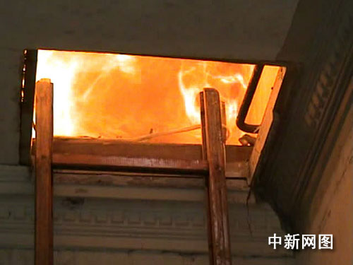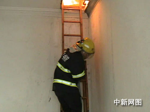 由于火場在樓頂、且入口處較小,消防隊員立即拿來了一把6米兩節拉梯,由一號車出一支水槍進行強攻滅火。