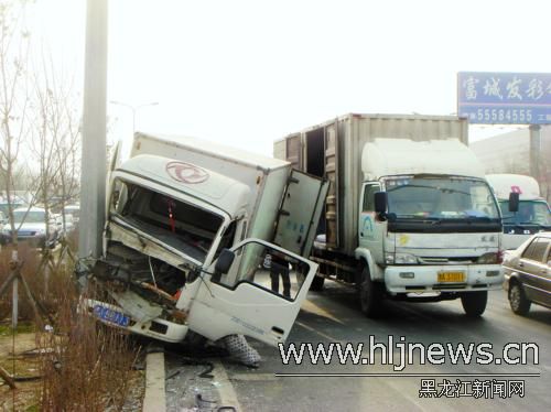 今日10時許,在哈市哈平路農機研究院路段,一輛白色廂式貨車行駛中前方車輛突然減速,貨車剎車不及只能轉向躲避,沖上路面的隔離帶撞到一根鐵柱方才停下。貨車駕駛室嚴重變形,破碎的風擋玻璃和機器零件散落一地,司機大腿被卡住。