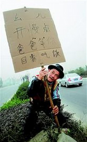 黑幕降臨,成青金快速通道梁勝村路口邊的平房?jī)?nèi),32歲的廖大姐正在灶房里做飯,5歲的女兒唱著歌溜出屋。突然一陣刺耳的剎車(chē)聲響起。廖大姐如觸電一般,手中菜刀墜落在地。奔出門(mén)外,見(jiàn)女兒并未走近路口,一把將其緊緊抱住……3天內(nèi),這個(gè)路口就吞掉了兩條人命。兩年多來(lái),僅梁勝村就有8名村民在此路口丟了性命,被稱(chēng)為“死亡路口”,在反映10余次無(wú)果后,昨(8)日,該村60歲的“弼馬溫”董永發(fā)將親手制作的警示牌立在了路口:“幺兒,開(kāi)慢點(diǎn),爸爸等你回家吃飯!”