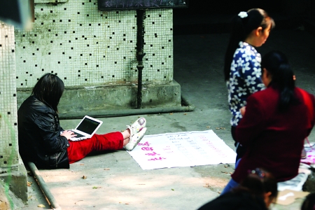 前日,網友“壞豬”在大渝網新聞報料吧上,以《史上最拉風 收廢品女》為名發帖報料。“壞豬”在帖子中稱,前日上午,他剛好從該居民樓前經過時,隱約看到樓梯口有一黑影,轉頭查看,眼前的景象將他雷得“外焦內嫩”:一身穿黑衣的女子,背靠墻壁席地而坐,身前放著一個寫有“專業回收”的廣告布,她對過往市民毫不理會,而是專心敲打放在其大腿上的筆記本電腦。“我還從來沒看到過哪個收廢品的有這個女的這么潮!太拉風了噻”。