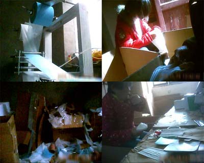 記者看到這里正在進行包裝,在這個所謂的廠家里生產衛生用品的工人們,沒有一個人穿著工作服,戴工作帽,包裝封口的機器,也是幾根木條定在一起,就湊合著用了,最出乎記者意料的,還不是這些簡陋的生產環境,而是包裝口罩的工人極不規范的動作,看到這個阿姨一邊蘸著唾沫一邊包裝口罩的手法,讓記者不禁為那些可能會戴上這包口罩的人感到擔心。