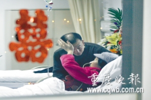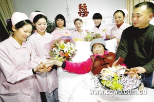 女子叫蔣翠,今年38歲。男人叫張兵,今年44歲。張兵推著妻子,輪椅軋過紅地毯,迎著空中的花瓣,進入病房。“祝福你們,你們讓我們懂得了攜手到老的承諾。”醫(yī)生護士共同祝賀夫妻倆,希望他們“新婚”快樂。看著布置成新房的病房,蔣翠哭出了聲音。“希望你們能堅持下去,恩愛永遠。”武警總隊醫(yī)院醫(yī)務處主任向貴平擔當起了主婚人的職務,向夫妻頒發(fā)了結婚證。這張結婚證也傾注了醫(yī)院醫(yī)生護士的心血。通過和南岸區(qū)民政局聯(lián)系、溝通,婚姻登記處工作人員特地到病房,為蔣翠辦理了結婚證。