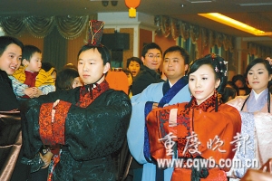 “重慶找不到,我們又到外地定制了這些陶器。”承辦該場婚禮的公司負責人宋先生介紹,新人的兩套衣服也是為他們量身定做,價格不菲。除此之外,司儀朗誦的文言文,也是鄭女士經過研究,自己修改而成。 記者 朱雋 通訊員 李東 攝影報道