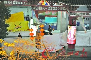 昨晚8時50分許,佛山市禪城區東方廣場德勝樓東南角前有近十輛警車停靠。在一樓某銀行營業廳門前的臺階上,一人多高的布將這里團團遮圍起來。