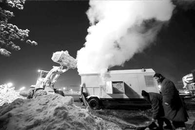 昨天凌晨,在人民大會堂東側路,環衛集團的新武器“融雪屋”正在進行“吃雪”作業。鏟車每隔幾分鐘就向“融雪屋”內倒入一鏟積雪,隨著一陣白色霧氣升起,積雪就被融雪屋“吃”掉,變成水流進了市政管線。從外表看,“融雪屋”就是一個橘黃色的方形體。負責操作的高師傅說,不要小瞧這個機器,它每小時能融雪25噸。“像這樣低的溫度,即使融雪劑與積雪充分混合,靠自然溫度融化減量也有一定困難,所以我們投入使用了這個新設備,加快積雪融化。”北京環衛集團作業部部長張志強說。