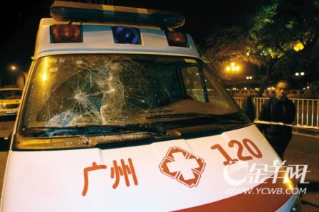 記者接報趕到現場,在沿江西路中山大學附屬第二醫院大門前,一輛車身噴有“廣州紫荊醫院”字樣的救護車停在路邊,車頭的擋風玻璃和右前門玻璃被砸爛,地上還留有砸車用的磚塊。紫荊醫院司機李先生雖然沒有被打傷,但是情緒還很激動。他告訴記者,他們接到電話稱,有病人需要救護車轉送茂名,救護車在中山二院門口剛停下來,“前后各一臺越野車便把救護車夾住,車上沖下來十多人,有人手上還拿著砍刀。”