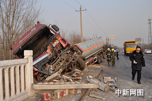 中新網洛陽1月27日電 (記者 李金輝 通訊員 王力)1月26日下午15時許,在洛陽市新安縣310國道磁澗鎮磁澗橋上,一輛滿載30噸氫氧化鈉的槽車不慎側翻,發生嚴重泄漏,周圍居民的生命安全受到極大威脅。