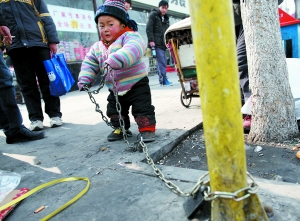 事件:因家中孩子無人照看,一名開摩的男子將兩歲的兒子用鐵鏈拴在路邊柱子上。