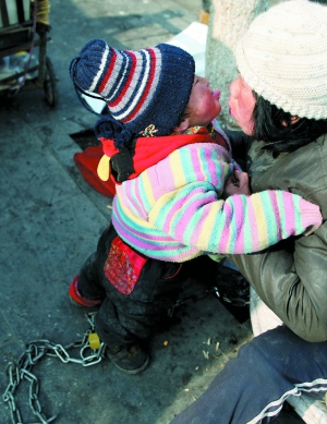昨日,房山良鄉(xiāng)華冠購物中心西側(cè),陳傳六正在趴活,臉上有多處凍瘡。距摩的兩米遠(yuǎn)的路牌子下鋪著紙板,放著簡易童車。他兩歲的兒子坐在紙板上喝著冷奶,奶嘴發(fā)黑。一名黑車司機(jī)朝小孩喊“金蛋兒”,小孩朝他笑。