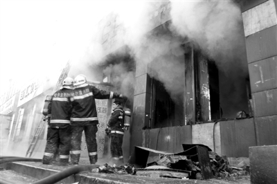 7時(shí)許,記者在現(xiàn)場(chǎng)看到,一家經(jīng)營(yíng)變頻器的門市房?jī)?nèi)冒出滾滾濃煙,火借風(fēng)勢(shì)很快將樓上一家旅店引燃,消防人員正在二層破拆打水撲救,并迅速將屋內(nèi)的煤氣罐轉(zhuǎn)移,二層的近10扇窗戶玻璃被擊碎排煙。經(jīng)過(guò)兩個(gè)小時(shí)的救援,火勢(shì)被控制住。此時(shí),門市房受損嚴(yán)重,室內(nèi)的物品被燒焦,窗戶玻璃破碎。人行道及車行道上的積水結(jié)了一層薄冰。