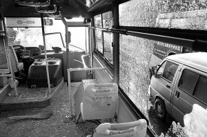 昨日17時,記者趕到現場。為了不使被砸的這輛25路公交車影響其它公交車發車,該車已經從站點移開。被砸公交車的前風擋玻璃、前車門玻璃以及車兩側近10塊車玻璃被砸碎,車內滿地是玻璃碎片。