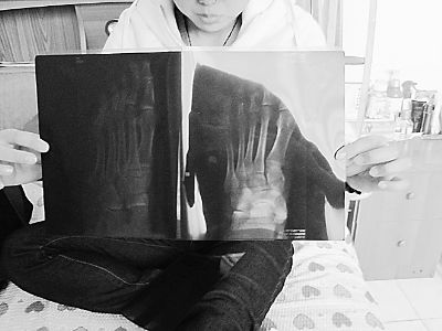 據(jù)李女士介紹,3月6日,她和丈夫一同去廣場南口金夫人婚紗影樓拍婚紗照。進攝影棚后,攝影師要求她光腳坐在一臺鋼琴旁的長板凳上拍攝。拍完這張照片后,攝影師又讓她往后站點,由于婚紗有近2米長,正當她起身往后退時,長長的婚紗將鋼琴旁的長板凳拖倒在地,板凳重重地砸在她的左腳腳趾上,她頓時感到萬般劇痛。然而攝影師的助理只是簡單問了問傷勢,并買來云南白藥噴在她腳上,她忍著劇痛繼續(xù)拍完最后一組婚紗照。晚上10時許,她和丈夫回到家中,才發(fā)現(xiàn)腳腫得很厲害。經(jīng)在雁灘骨傷科醫(yī)院檢查,左腳第5根腳趾斷裂。